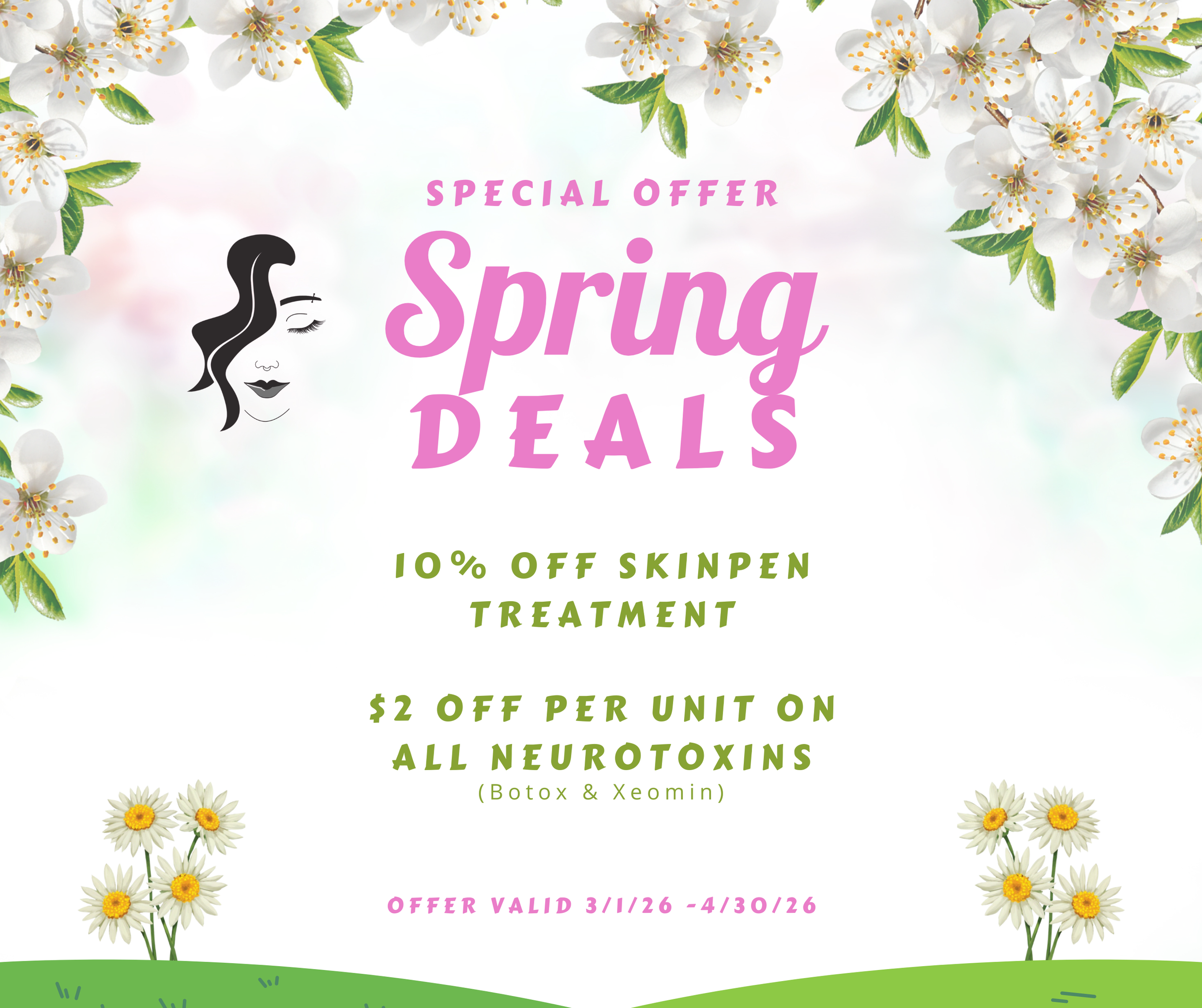 Elevate your self-care routine this spring by taking advantage of our incredible offers on neurotoxin injections and rejuvenating microneedling treatments with the acclaimed SkinPen. These treatments are designed to enhance your natural beauty, promote healthier skin, and boost your confidence. Don’t miss this opportunity to invest in your skin's well-being and achieve a radiant complexion.